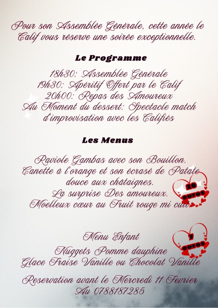 Le CALIF vous invite Ă une soirĂ©e pleine de chaleur, de rires et de saveurs Ă lâoccasion de lâAssemblĂ©e GĂ©nĂ©rale du CALIF, transformĂ©e pour lâoccasion en un moment festif et amoureux : le CALIFEST â€ïž